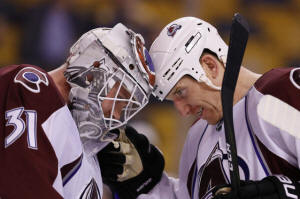 Avalanche goalie Calvin Pickard (31) celebrates with left wing Cody
