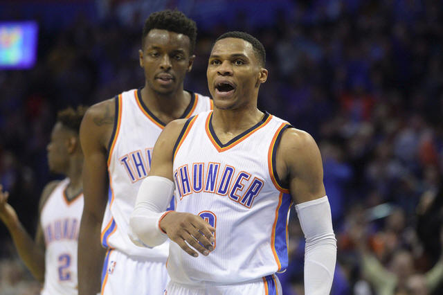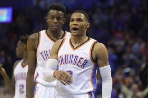 Thunder guard Russell Westbrook (0) reacts after a play against the
