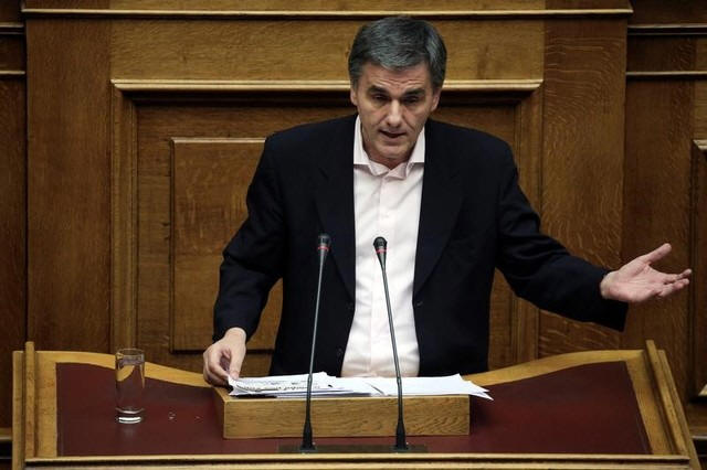 Greek Finance Minister Euclid Tsakalotos delivers a speech during a