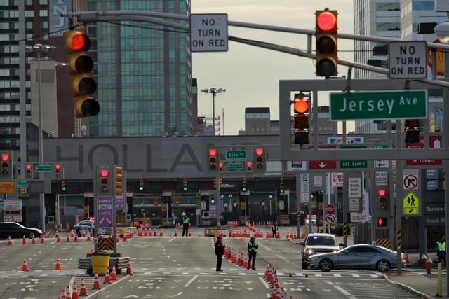 Police officers stand guard at the entrance of Holland Tunnel