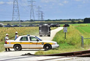 Authorities head down a dirt road toward to investigate the scene of