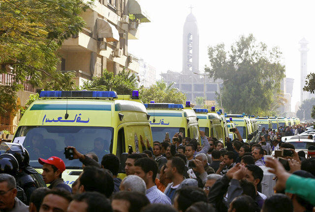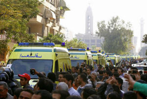 Egyptian Christians shout slogans as ambulances transport the bodies
