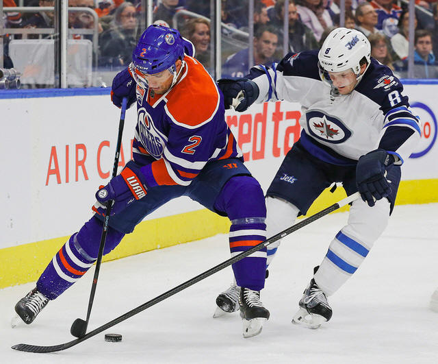 Oilers /2 and Winnipeg Jets defensemen Jacob Trouba (8) battle for a