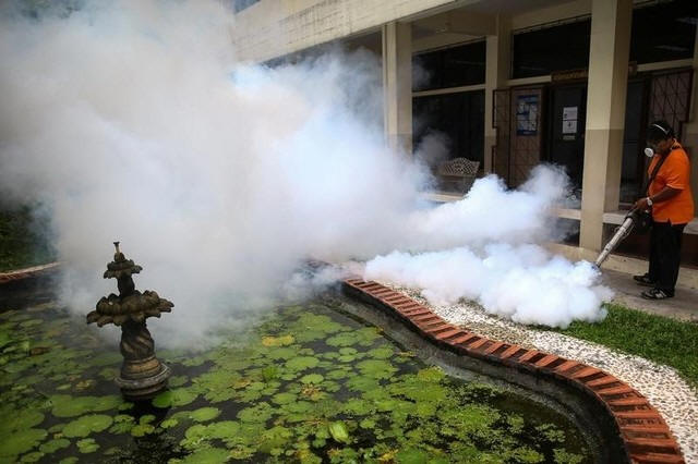 fumigates the area to control the spread of mosquitoes at a