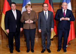 German Economy Minister Sigmar Gabriel, Chancellor Angela Merkel, French President Francois Hollande and French Minister for Economy and Finance Michel Sapin pose for a picture at the Franco-German digital summit in Berlin, Germany, December 13, 2016. REUTERS/Fabrizio Bensch |