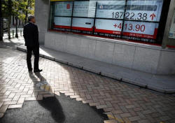 A man looks at an electronic board showing Japan's Nikkei average