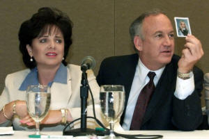 Patsy Ramsey and her husband, John Ramsey (R), produce a picture of