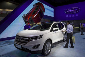 A visitor (R) gets in a Ford Edge SUV at the 13th China (Guangzhou)