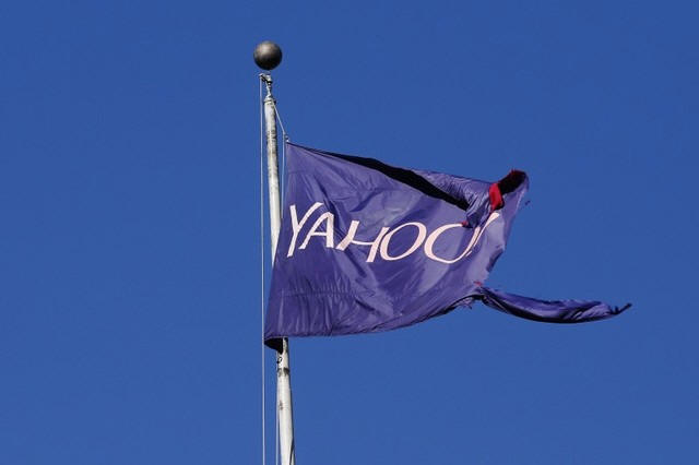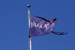 A tattered flag bearing the Yahoo company logo flies above a