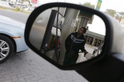 A fuel pump assistant fills cars with petrol at Budaiya Fueling
