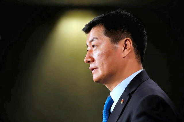 Lobsang Sangay speaks during a news conference on Parliament Hill in