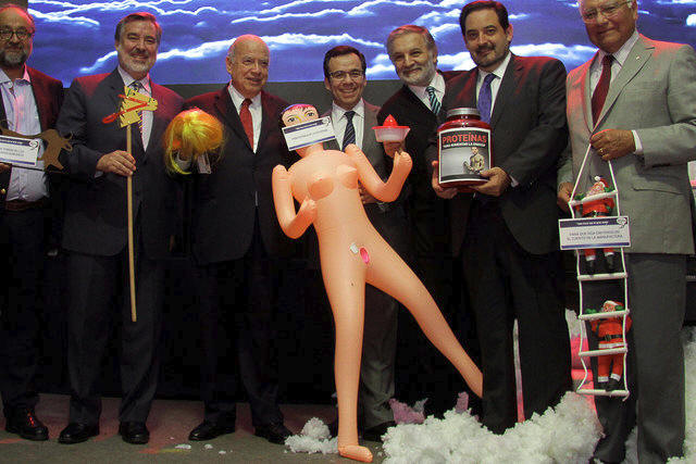 Chile's economy minister Luis Cespedes (C) holds up an inflatable