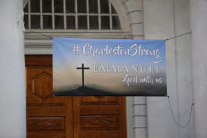 A Charleston Strong banner hangs from a church across from the