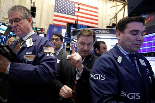 Traders work on the floor