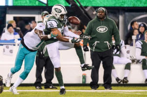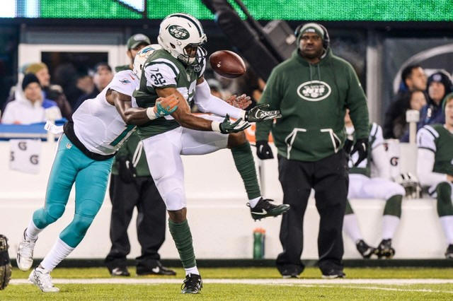 Jets cornerback Juston Burris (32) intercepts a pass from Miami