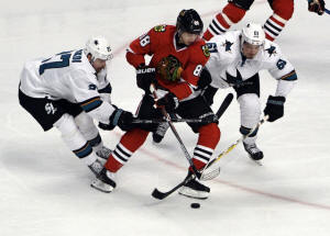 Blackhawks score three in third, down Sharks