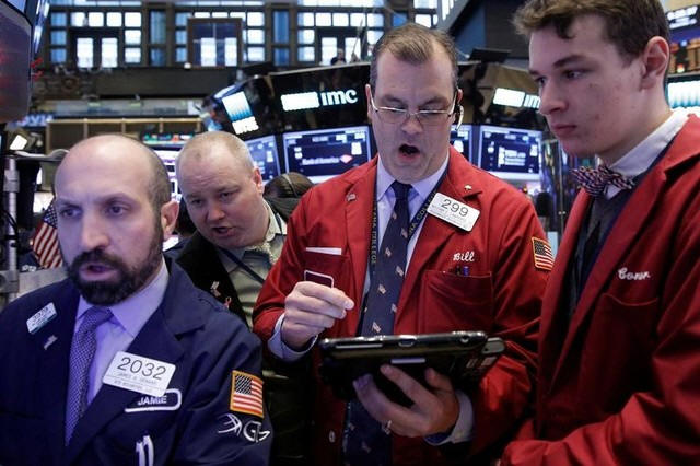 Traders work on the floor