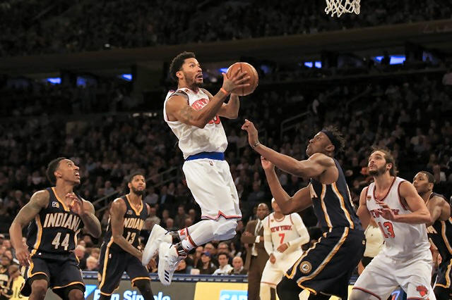 Knicks guard Derrick Rose (25) drives to the basket past \Indiana