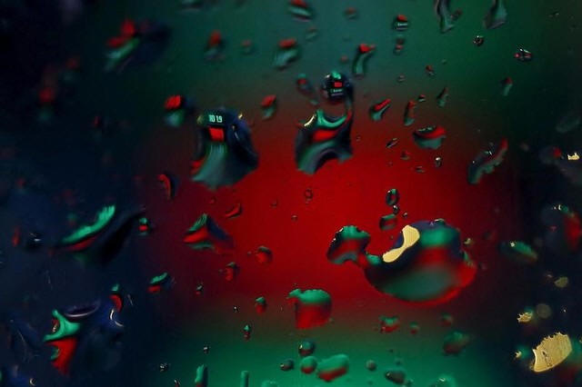 pence ($1.46) a litre is seen in a raindrop on a car window at a