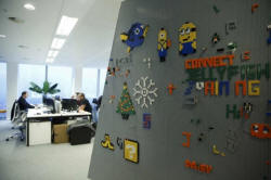 A worker passes an erasable ideas wall at the Jellyfish office space