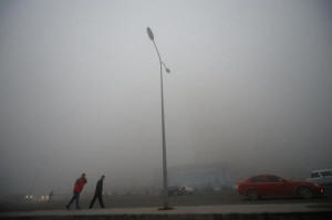 People walk in heavy smog during a polluted day in Jinan, Shandong
