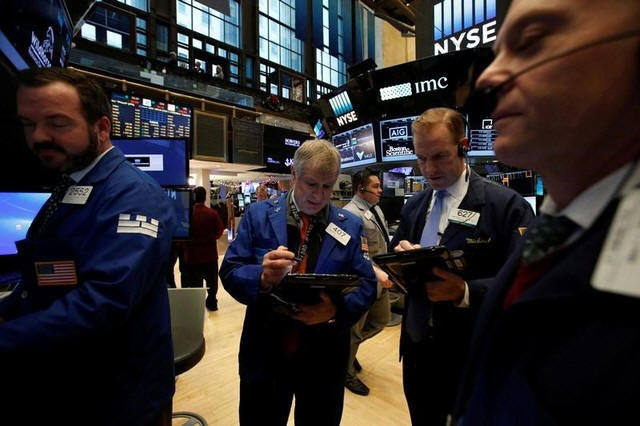 Traders work on the floor at the opening of the day's trading at the