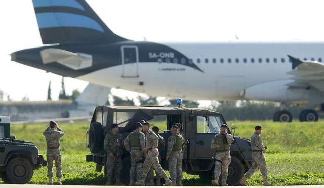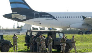 Maltese troops survey a hijacked Libyan Afriqiyah Airways Airbus