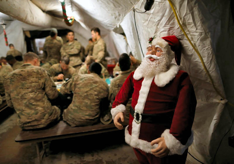 soldiers enjoy a Christmas dinner at an army base in