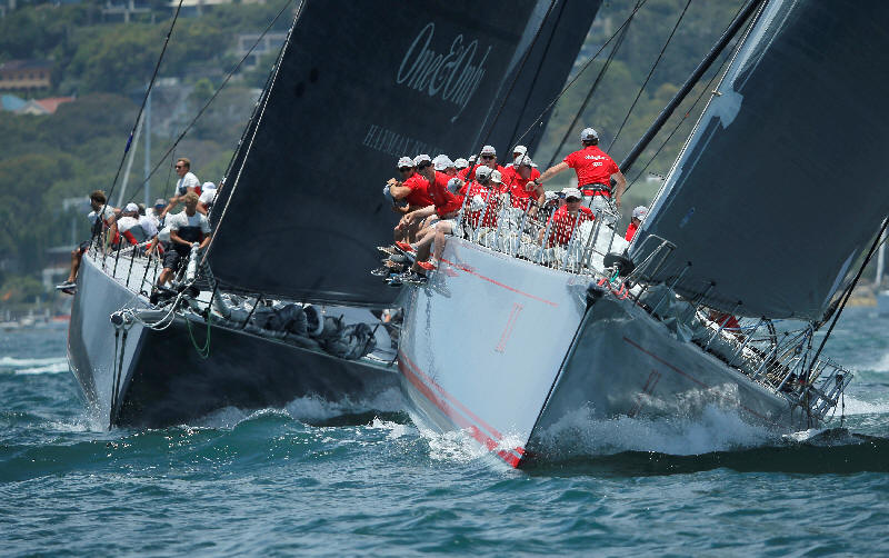 yacht Wild Oats XI (R) leads Scallywag on its way to