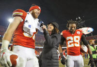 (29) talk with media after the game at Arrowhead Stadium. The