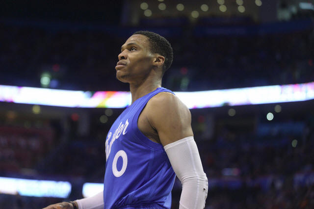 Thunder guard Russell Westbrook (0) reacts after a play against