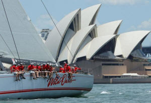 The yacht Wild Oats XI leads the field past the Sydney Opera House