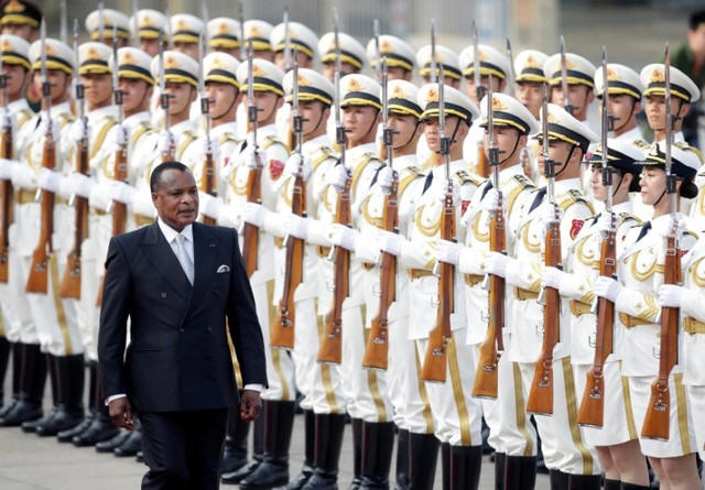 Congo Republic President Denis Sassou Nguesso reviews honour guards