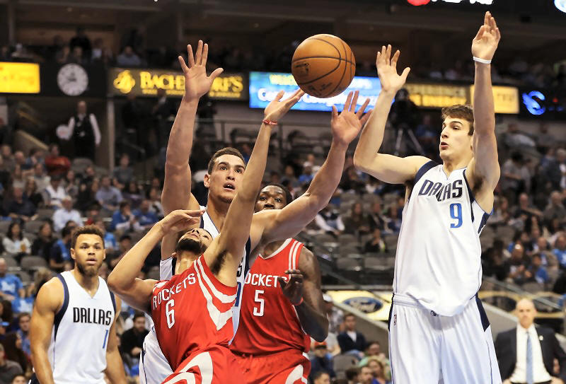 Nicolas Brussino (9) and forward Dwight Powell (7)