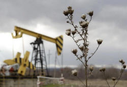 Plants are pictured near an oil pump, owned by oil company Rosneft,