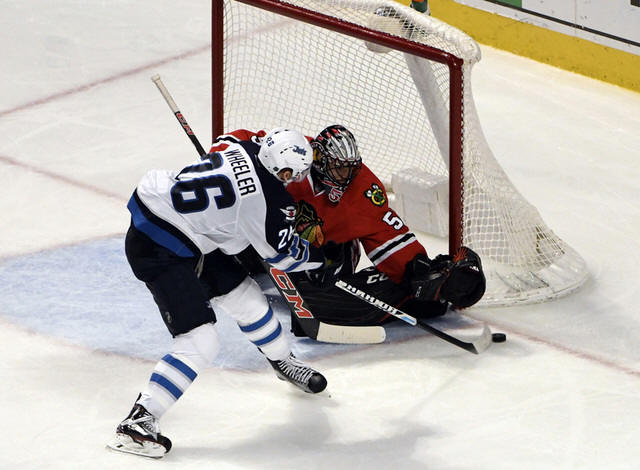 Crawford (50) makes a save on Winnipeg Jets right wing Blake Wheeler