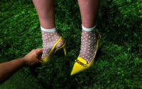 adjusts a model's foot at the Kate Spade Spring/Summer 2014
