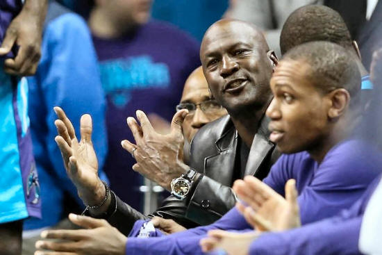 Hornets owner Michael Jordan yells at an official in the