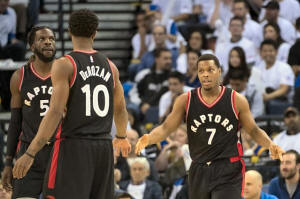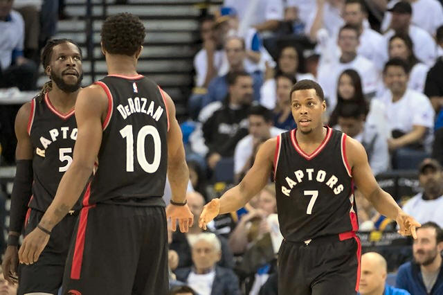 Raptors guard Kyle Lowry (7) is congratulated by guard DeMar DeRozan