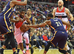 Pacers forward Thaddeus Young (21) fouls Washington Wizards guard