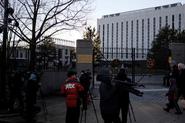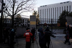 Television crews assemble outside the Russian embassy on Wisconsin