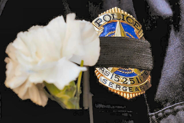 A Dallas police sergeant wears a mourning band and flower on his