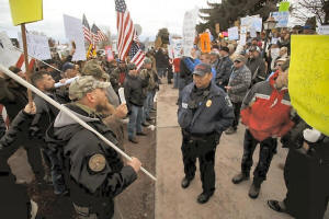 demonstrators on both sides of an armed occupation of a federal wildlife