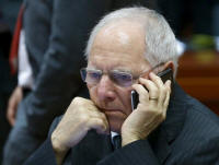 Minister Wolfgang Schaeuble speaks on his mobile phone as he