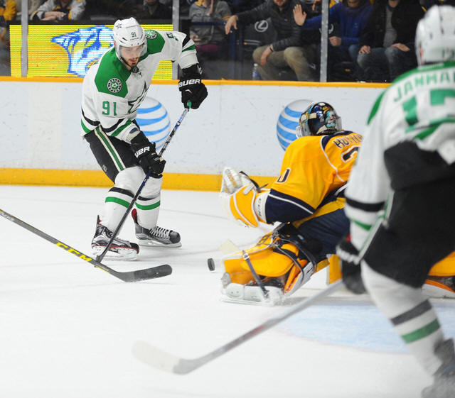 Center Tyler Seguin's wrister was stopped by goalie Carter Hutton