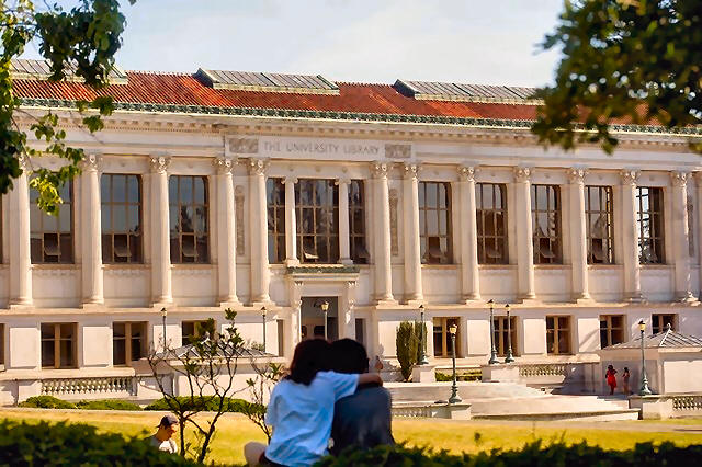A couple sits in front of Doe Library at the University of