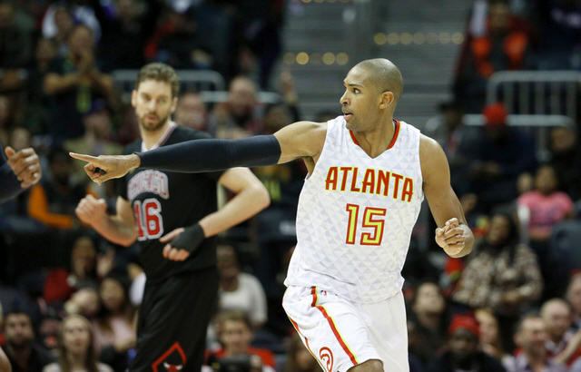 Hawks center Al Horford (15) celebrates a basket in the fourth