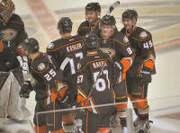 Ducks center Rickard Rakell (67) celebrates with teammates his