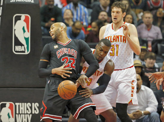 forward Paul Millsap (4) steals the ball from Chicago