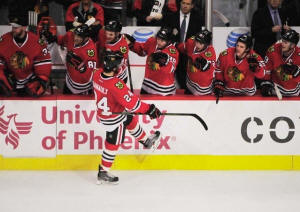 Blackhawks defenseman Niklas Hjalmarsson scored the first goal with